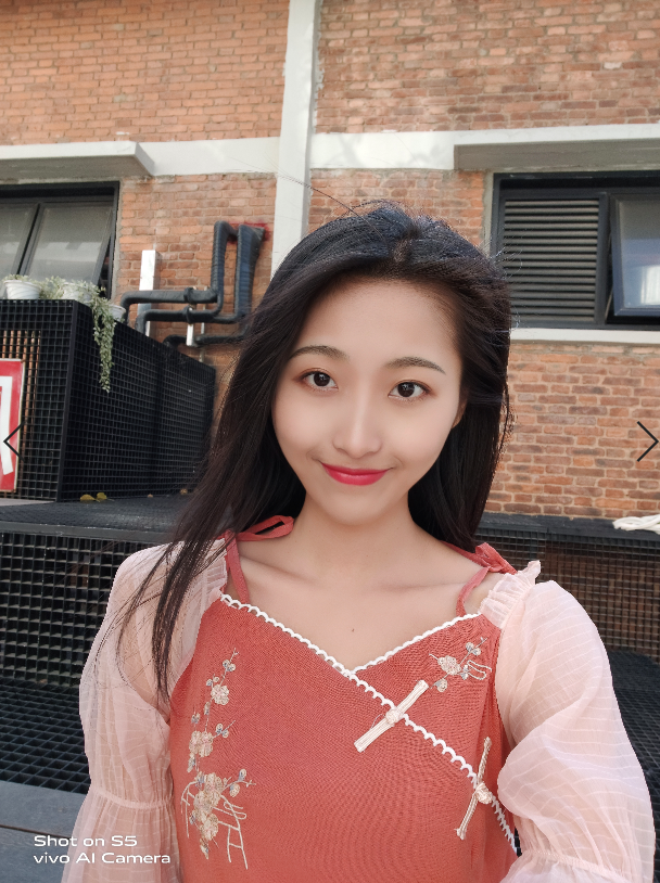 vivo S5前置使用了3200万像素的摄像头,并且加入了顶尖美颜功能。话不多说,我们直接看下面这张样张。这张实拍样张是经过vivo S5的5重超质感美颜功能之后所拍摄出来的,我们可以看到效果非常棒。首先是脸部的颜色和脖颈部的颜色非常统一,并没有出现只美颜一部分的情况。其次我们可以看到皮肤的质感非常真实自然,虽然经过美颜处理,但是更接近人物的原始质感。最后我们再看一下样张的细节部分,无论是头发还是衣服的细节部分表现的的十分到位。