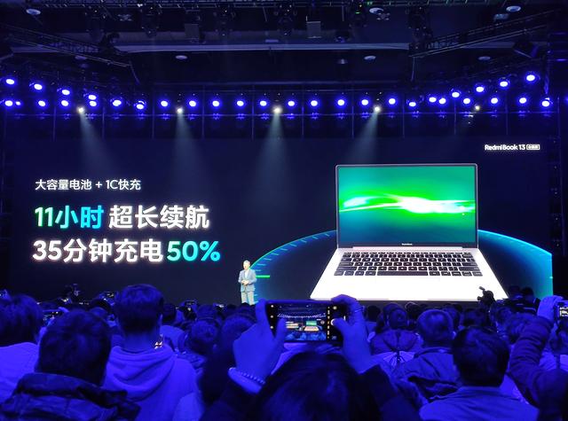 还有一点大家比较关心的——续航,RedmiBook 13全面屏笔记本也是考虑到了,根据卢伟冰发布会公布的数据来看,RedmiBook 13全面屏笔记本续航可以达到11小时,而且充电速度也比较快——35分钟充电50%,这都是为移动办公用户做的一个保障,很赞!