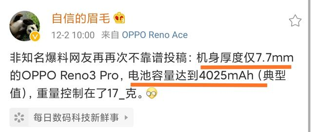 关于新品,我们从OPPO全球副总裁沈义人的微博上获取一些信息,首先是大家都知道的双模5G芯片——骁龙765G,将会是这次手机的核心,这样就一步到位,为大家带来更全面的5G体验!而其他方面,OPPO Reno3 Pro拥有更轻薄的机身——7.7mm,摄像头微凸,重量为171g。但是即便如此,这次的电池还是维持在了4025mAh,考虑到5G带来的功耗,这样的搭配续航方面应该一天一充没问题。