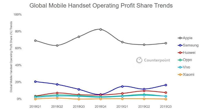 此外,另一组数据也是引起了广泛的关注,这就是第三季度全球手机市场利润的分布情况,根据知名数据分析机构Counterpoint公布的数据显示,苹果今年第三季度在手机利润上再次碾压对手——拿下了智能手机市场66%的利润,蝉联了利润的冠军,第二名则为销量多次蝉联第一的三星(利润份额17%)。其实苹果的成绩也是意料之中的事情,毕竟新iPhone依然是做到了破万的价格,但是同时也是为此感到一丝丝心寒,这是行业的一种“病态”。