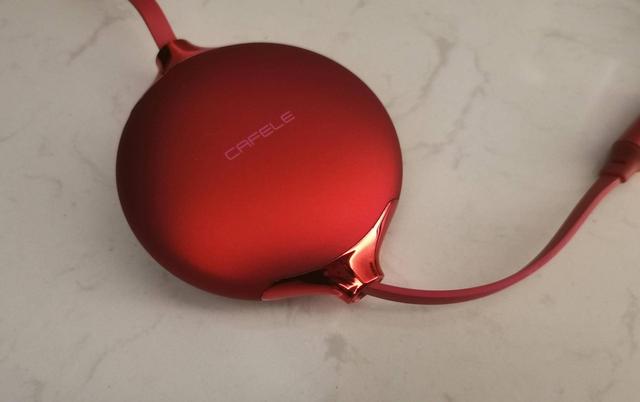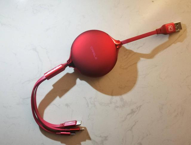卡斐乐雅动系列伸缩数据线共有暗夜绿、中国红、典雅黑三种配色,个人感觉红色更好看一些,单拉数据线的收纳在中间圆鼓鼓的部分中,如果能在旁边做一个挂钩,挂在背包上完全可以当成装饰品了。