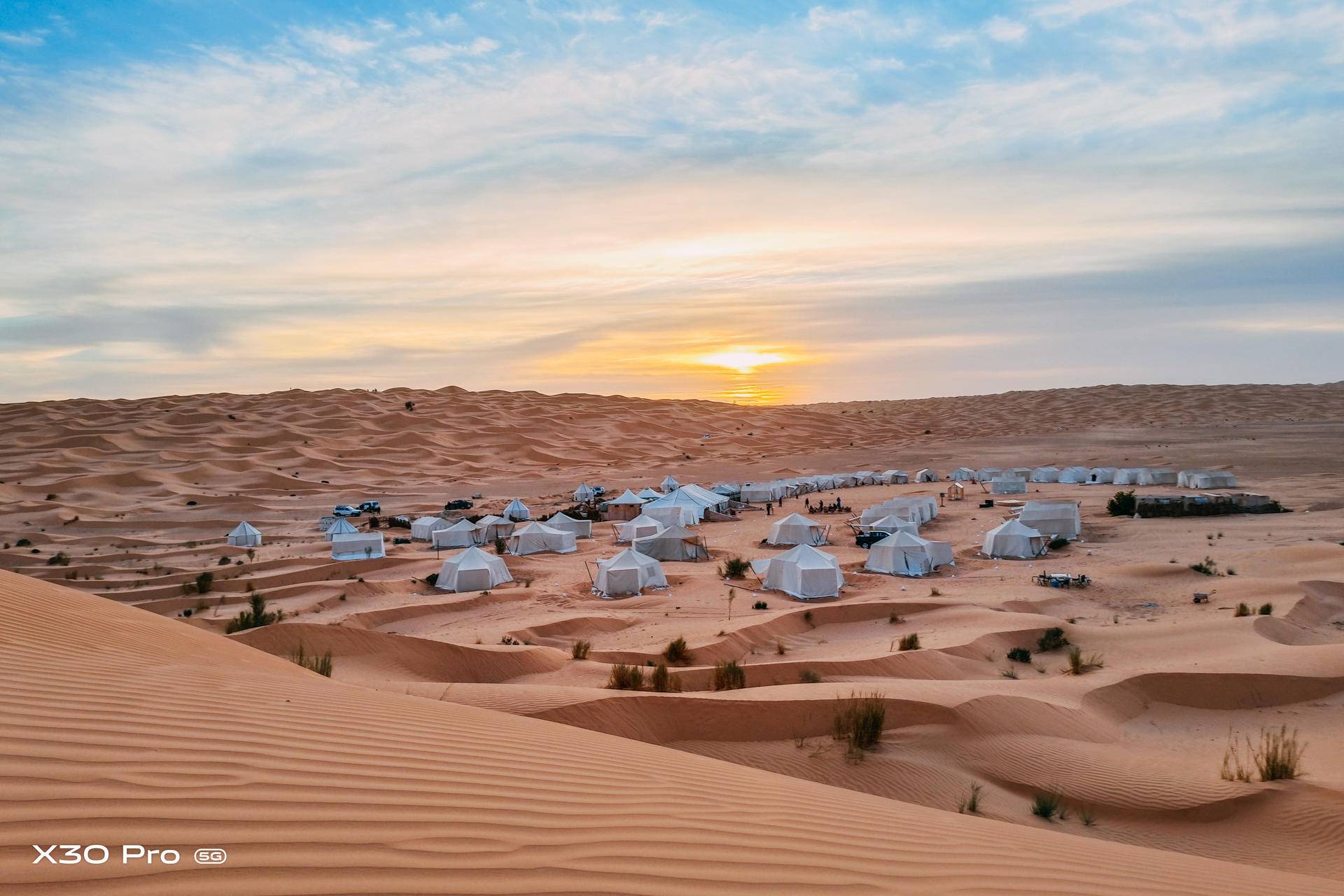 接下来,是一张使用vivo X30 Pro超广角功能拍摄的样张。基于112°超大的视野范围,这张图片中容纳的景物明显增加。湛蓝的天空于视线消失之处与沙漠连接在了一起,而白色的帐篷、“孤单”的梭梭树等细节也被很好地保留了下来,这张照片可谓是完美还原了当时的美景。