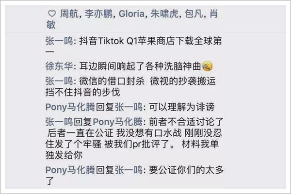 在发完朋友圈的第二天,两人却在朋友圈唇枪舌剑起来。张一鸣主动抱怨“微信借口封杀抖音,微信抄袭抖音,但这挡不住抖音的步伐”。“可以理解为诽谤”,马化腾罕见地回怼。