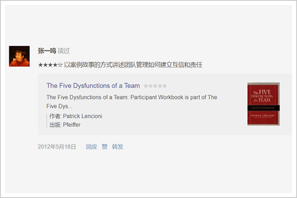 这本书显然给了张一鸣很大的启发,让他在自省的道路上更进了一步。他这样评价道:以案例故事的方式讲述团队管理如何建立互信和责任。