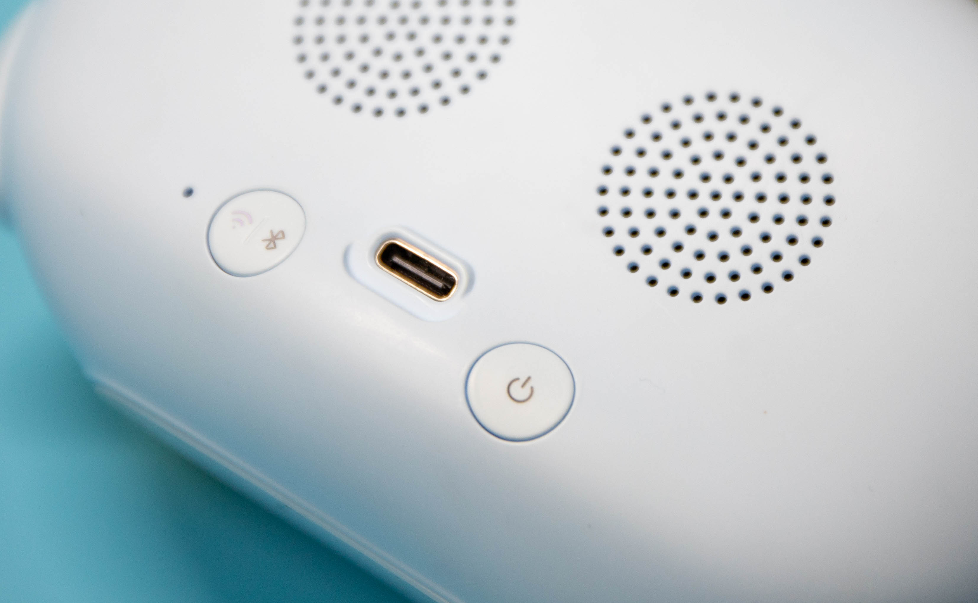 在背面我们可以看到左右两边是有它的两个喇叭的声道,中间部位是USB type——c接口。在左下方有蓝牙/WiFi切换按键右边为电源按键。