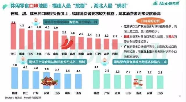 Mob研究院 《2019休闲零食行业深度解读》报告中指出,江浙沪和广东省对辣味抱怨最多,两湖、江西和四川抱怨最少;福建消费者对口味最为挑剔,广东对甜腻和咸口的抱怨声较高。