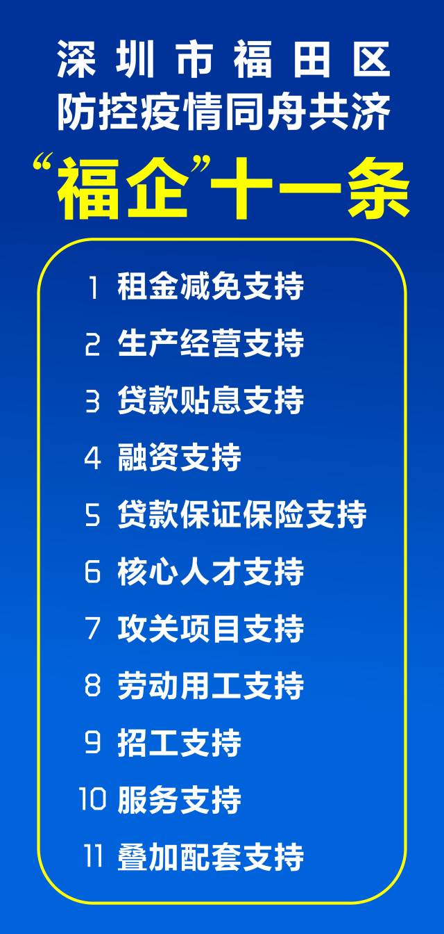 “福企”11条的出台,将为福田区企业带来:给予租金减免支持、生产经营支持、贷款贴息支持、融资支持、贷款保证保险支持、核心人才支持、攻关项目支持、劳动用工支持、招工支持、服务支持、叠加配套支持等11条红利。