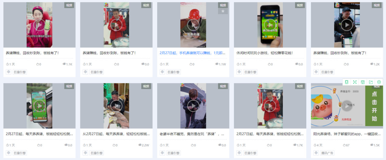 AppGrowing分析师:《阳光养猪场》是以“网赚玩法”为重点的模拟经营游戏,素材反复强调“玩游戏赚钱”。在创意方面,游戏通过日常消费场景卖猪付款、声称减轻经济负担等。其中近8成的素材是视频广告,多采取大爷大妈等接地气的角色演绎对应的情景剧,迎合下沉市场群体的偏好。“轻松”“提现”“赚钱”“简单”“零花钱”是这款App在广告文案中反复强调的点。