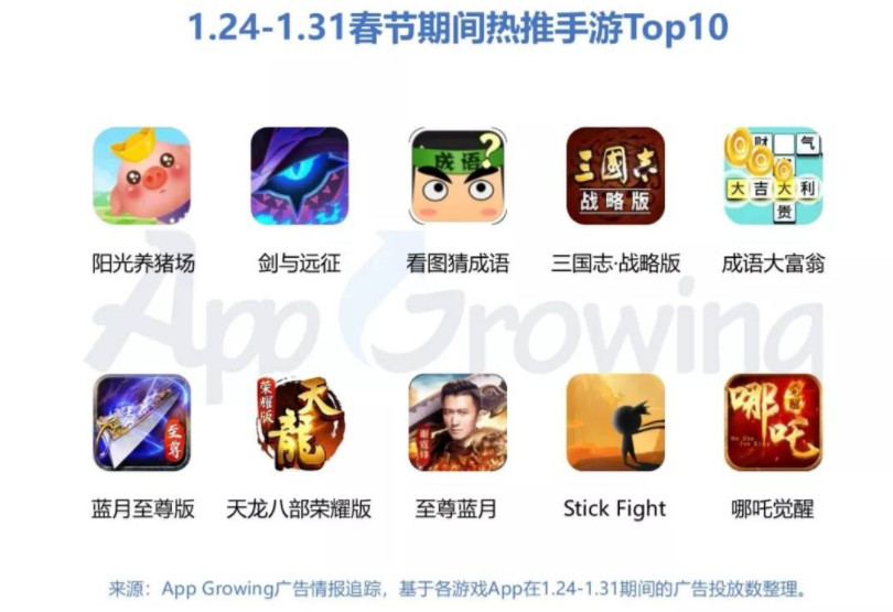 AppGrowing分析师:春节期间,手游广告休闲风盛行,棋牌,休闲游戏在投放上都比较强势。春节假期赶上新冠病毒蔓延,全民被宅,宅经济促进手游小爆发,而从数据上看游戏行业在春节的投放预算明显增长,转化率也较好。