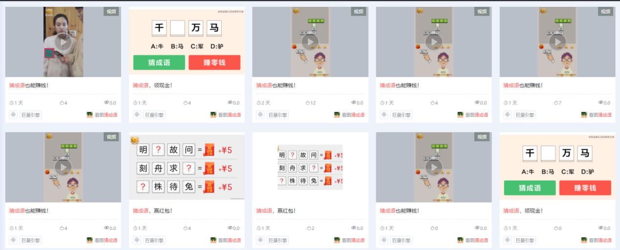 此外,前几年传奇游戏广告素材会强调挂机回收装备“赚钱”这个点。而现在的趋势是,更多偏休闲游戏开始以“赚钱”为创意亮点做宣传,诸如猜成语和模拟养成之类的游戏。它们的整体投放力度呈现逐渐加强的趋势。不同于其他休闲游戏强调“爽”“快”“上瘾”等创意点,“网赚类”的休闲游戏的买量主打下沉市场,因为玩法简单,现金刺激,预计会吸引更广泛的非游戏群体关注。