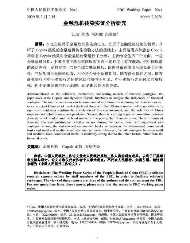 央行今日发布工作论文《金融危机传染实证分析研究》,论文指出,一是金融危机时期,中国股市下跌与美国股市下跌一定程度上存在联动,但中国股市的波动也有一定独立性;二是全球金融危机后,国内股市和债市呈现显著负相关性;三是从国内金融机构看,不论是否处于危机期间,国有商业银行之间、国有商业银行与中小型银行之间的风险传染并不明显,中小型银行之间风险传染较强,但不是由金融危机引起的,而是由其他因素导致。