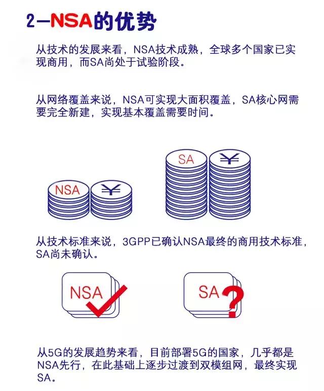 据了解,NSA(非独立组网)以及SA(独立组网)都是全球通用的两种5G组网方式。其中NSA组网是在原本4G基站的基础上增添5G基站,其覆盖范围广、技术更加成熟。而SA组网是属于独立组网,专属SA基站需要选址建设。它不仅修建时间长、耗资高,最关键的就是在5G初期的覆盖范围小。
