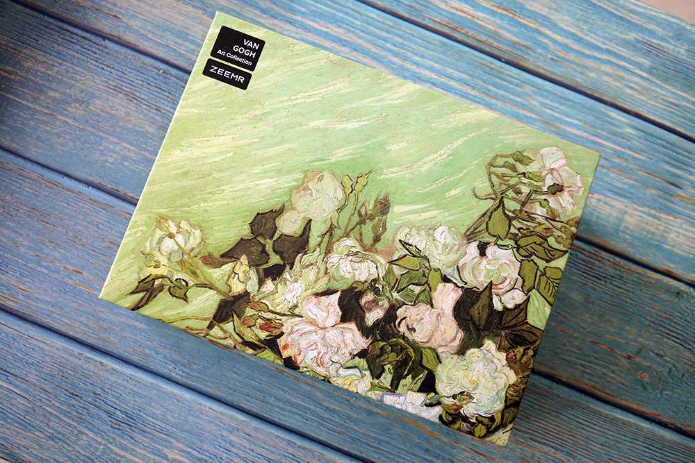 这款知麻投影仪 M1有四种配色,它们分别是皓月白、青空绿、午夜蓝和梵高限定联名款。我入的就是梵高联名款,这款的包装就是一个礼盒,在包装盒的正面有着梵高的艺术大作,而在包装盒正面的左上角,则有着品牌商标和梵高限定联名款字样。
