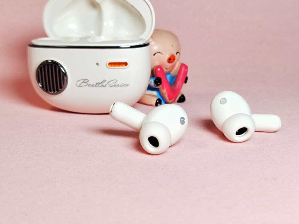 这款云岩白耳机有种淡淡的复古风,特别是正面的左侧有着竖条状的窗口,像极了儿时收音机的模样!右侧是一块精致的电量提示灯,可以清晰地知道仓盒的电量。