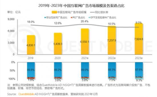 ,当互联网广告行业出现后,使传统广告渠道的规模大幅放缓。跟随互联网的发展,网民人数暴增,也使得广告行业进入到了互联网PC时代,仅在国内如新浪、搜狐、腾讯、网易之类,凭借平台广告收益,便成长为一个个互联网“巨人”。,2012年是互联网广告行业的第一次拐点,移动互联网的出现,开始进一步压缩传统广告渠道的空间,同时也开始侵蚀PC渠道,即便当时电视广告仍然占据整个广告市场的三分之一,但传统广告的负增长时代也就此来临。,2013年《哈佛商业评论》有一期中文版增刊,其封面标题定为“传统广告已死”,引发了广告行业的一片哗然。但这句话背后的真正意义,其实是下面的那行小字:广告业的未来,是基于大数据分析与APP形态的广告,但创意仍是好广告的来源。,截止到2021年,国内互联网广告收入已经超5000亿元,稳稳占据整个广告与营销市场的半壁江山。此外,互联网广告行业也迎来了第二次结构性变革的拐点,即以OTT为代表的渠道开始反超PC渠道。,近日,QuestMobile发布了《2021中国互联网广告市场洞察》,其中有组数据显示,PC广告份额不及OTT及智能硬件,这也是OTT渠道的首次反超,并且QuestMobile预测,PC渠道与OTT渠道的占比差距还将越来越大,这也代表着以OTT为渠道的大屏广告再次重回消费者视野。,
