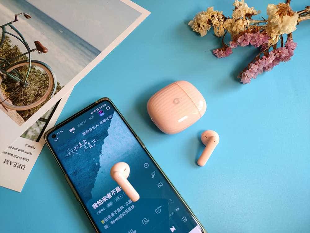 打开收纳盒,就可以看到里面粉粉的耳机,耳机与收纳仓采用了两种不同的材质,耳机采用了钢琴烤漆表面,光滑圆润有质感,给人一种元气满满的气息。