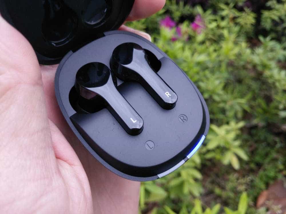 充电仓正面印有耳机的品牌logo,右侧有Type-C充电接口,支持正反插,除了能给耳机充电外,还能在监听模式下作为发射器使用。整体设计得相当小巧轻便,能轻松放入包包中携带,在坐车中想听歌时就能随手拿出使用。