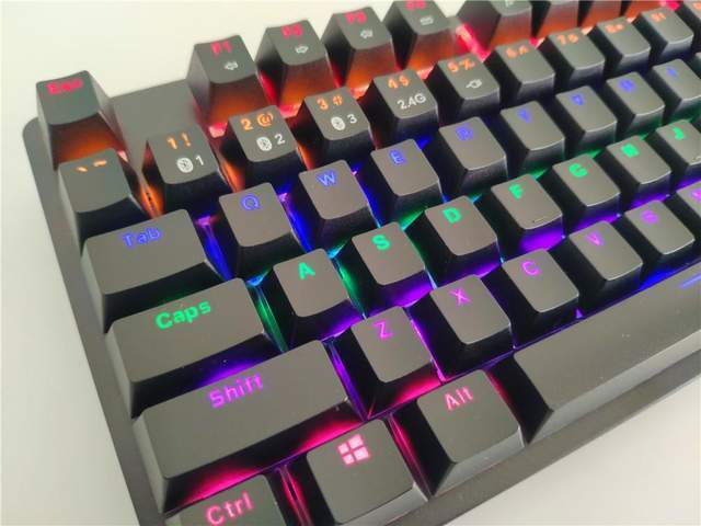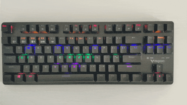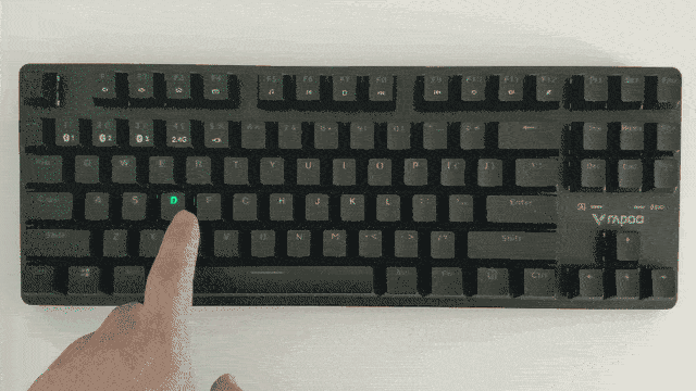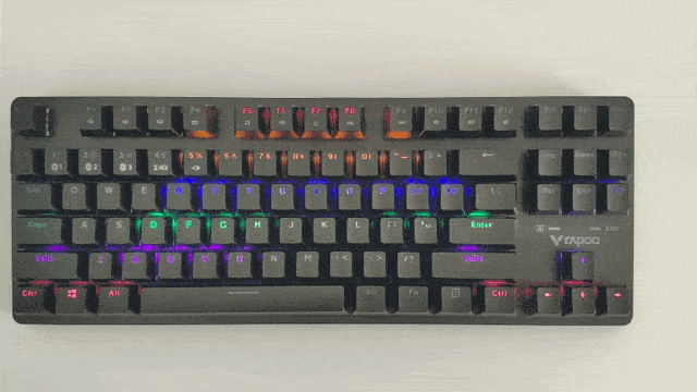 雷柏V500PRO-87多模版采用混采背光系统,支持6种背光模式(涟漪模式(默认)、常亮模式、单点亮模式、呼吸模式、繁星点点模式、曲线模式。),以及4种亮度供用户选择,可以通过Fn+右侧Ctrl键实现灯光模式调节,Fn+上下键实现亮度调节,Fn+左右键实现灯光速度调节。