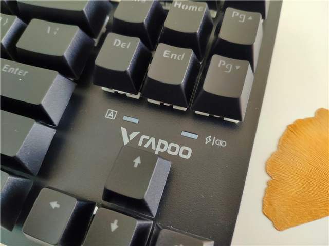 雷柏V500PRO-87多模版键盘面板采用的是金属材质,金属面板表面磨砂设计,整体质感和手感表现不凡。键盘右下角的大小写切换以及充电模式指示灯。