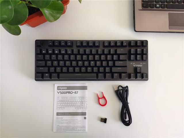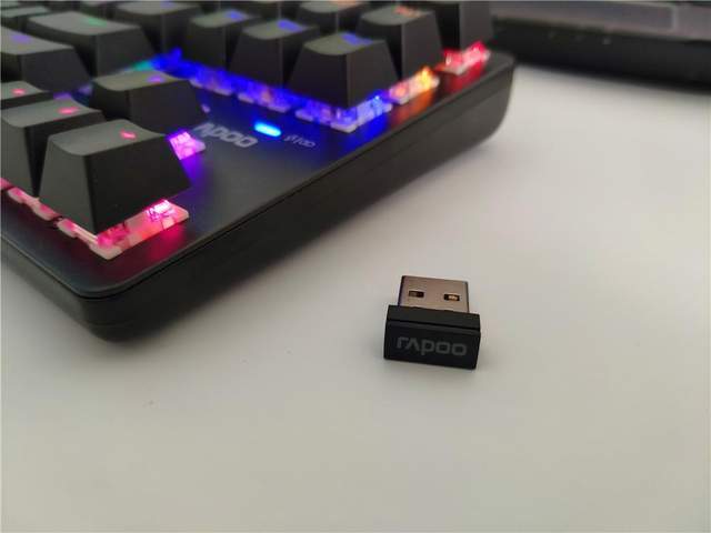 雷柏V500PRO-87多模版支持2.4GHz无线连接,配备专用USB接收器。接收器小巧,尾端印有RAPOO标识。不过键盘未设置接收器收纳仓,外出使用需单独携带,容易丢失,如键盘上有专用接收器收纳仓,就更好了。