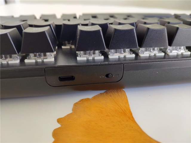 雷柏V500PRO-87多模版顶部中间位置,有电源开关和充电有线二合他Type-C充电接口,可连线当有线键盘使用,也可无线使用,键盘内置4000mAh高能锂电池,能够提供长时间续航。当键盘的状态指示灯呈红灯慢闪时,表明电量不足,需要充电;充电时,指示灯呈红灯常亮状态;充满电后指示灯熄灭。