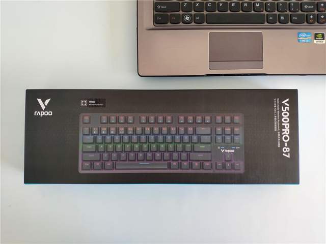 雷柏V500PRO-87多模版的包装延续着雷柏游戏系列产品经典的黑蓝配色,包装盒正面是键盘高清大图,左上角位置是Rapoo品牌LOGO和雷柏轴体颜色贴纸,右侧是键盘的具体型号,背面用多国语言介绍产品的主要卖点,大家通过包装就可以对新品有初步了解。