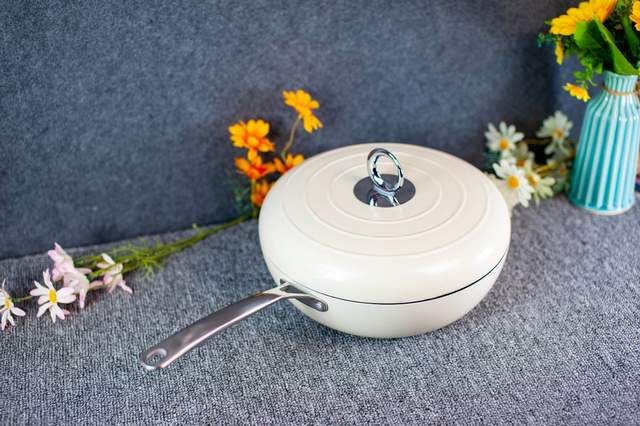 这几年非常流行更健康的珐琅锅具,珐琅锅具好在哪里?珐琅材质很好理解,其实就是一种特殊的瓷釉涂层,主要由高强度石英、玻璃、陶瓷釉、长石等组成的硅酸盐矿物质涂烧在金属底坯表面上,算是无机玻璃瓷釉。它有很多优点,导热快、受热均匀而且还保温,尤其是它的固有特性不易被腐蚀,烹煮食物时,不会产生化学反应,没有有害物质。中科德马克白月光不粘锅就是中科院纳米研究院把珐琅锅和炒锅合二为一的高颜值珐琅炒锅。