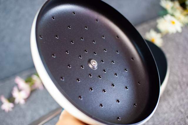 尤其是它的锅盖的里面不仅有与炒锅一样的不粘涂层,还贴心设计了43颗黄金凝水点能够锁住营养和水分,激发食材的鲜味,它没有排气孔,靠锅盖的重量起到一定的压力锅效果,所以锅盖很重,巧妙的设计让它使用完之后锅盖是不存水的。
