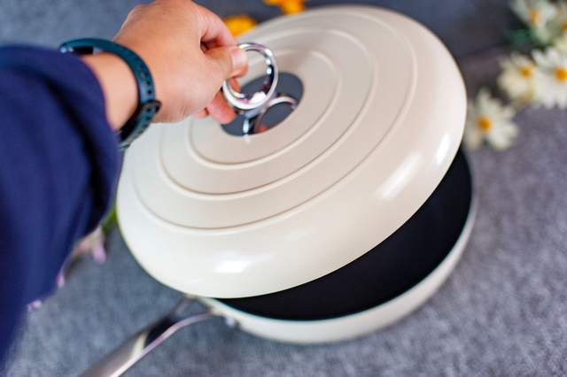 虽然叫做白月光,但中科德马克的不粘炒锅并不是纯白色,而是经过柔和处理的乳白色,没有那么扎眼,它的锅盖非常大,进过了艺术化的设计,中间的把手像一弯新月,而四周的圆环则是水波涟漪。