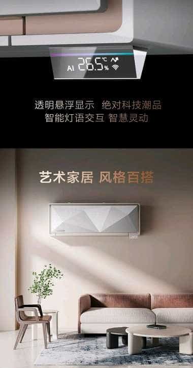 空调右下角是云米Space E的悬浮亚克力彩屏面板,能呈现遥控器、手机、远场语音的控制信息显示,科技感十足。