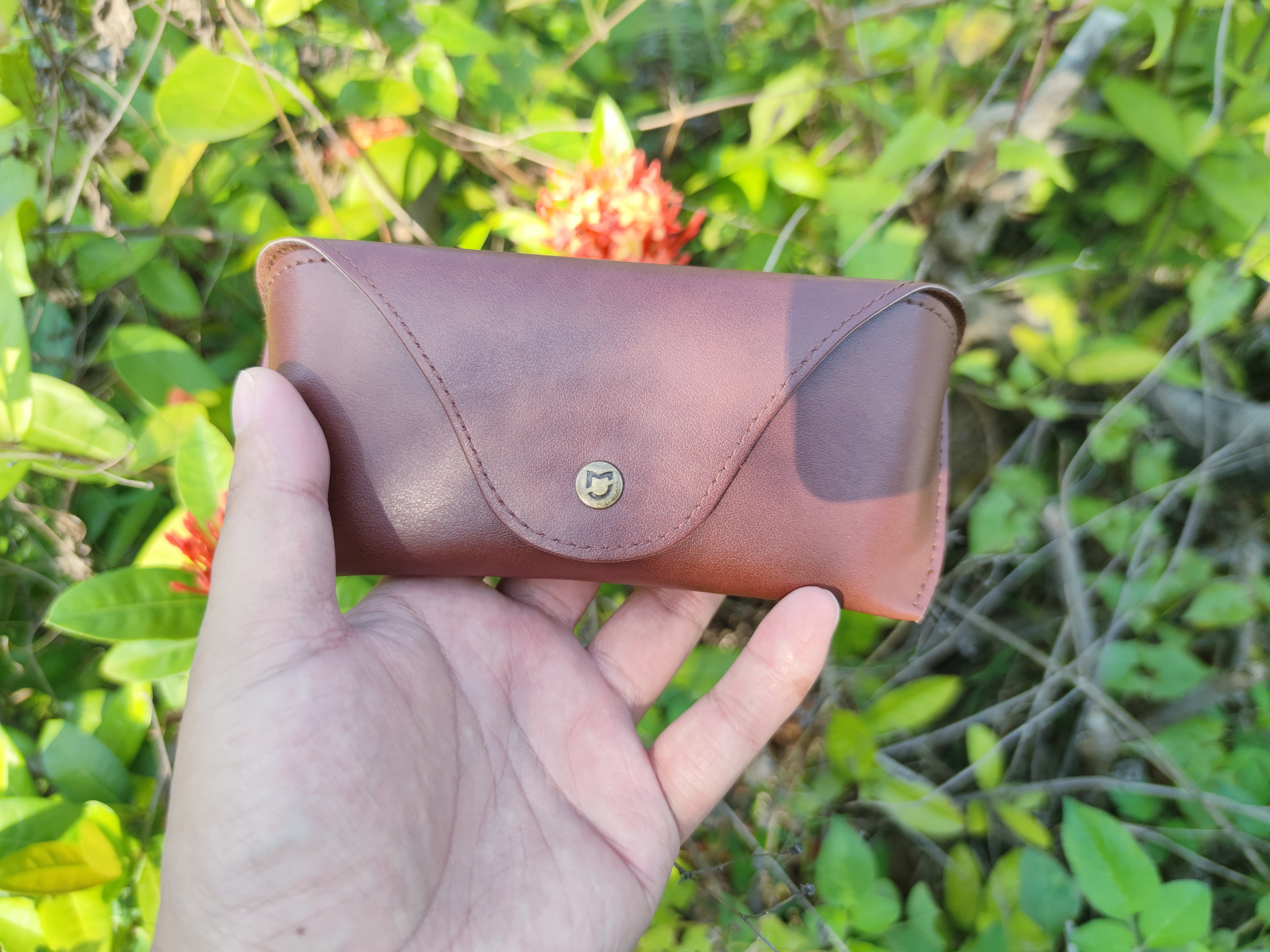 最后还要说一下,原装一起还送了一个古铜色皮质眼镜盒,也挺有创意,按扣的,看起来软的其实是硬的,不用的时候,放到里面也可以避免眼镜被刮花。当然眼镜布也有送,擦起来也方便。