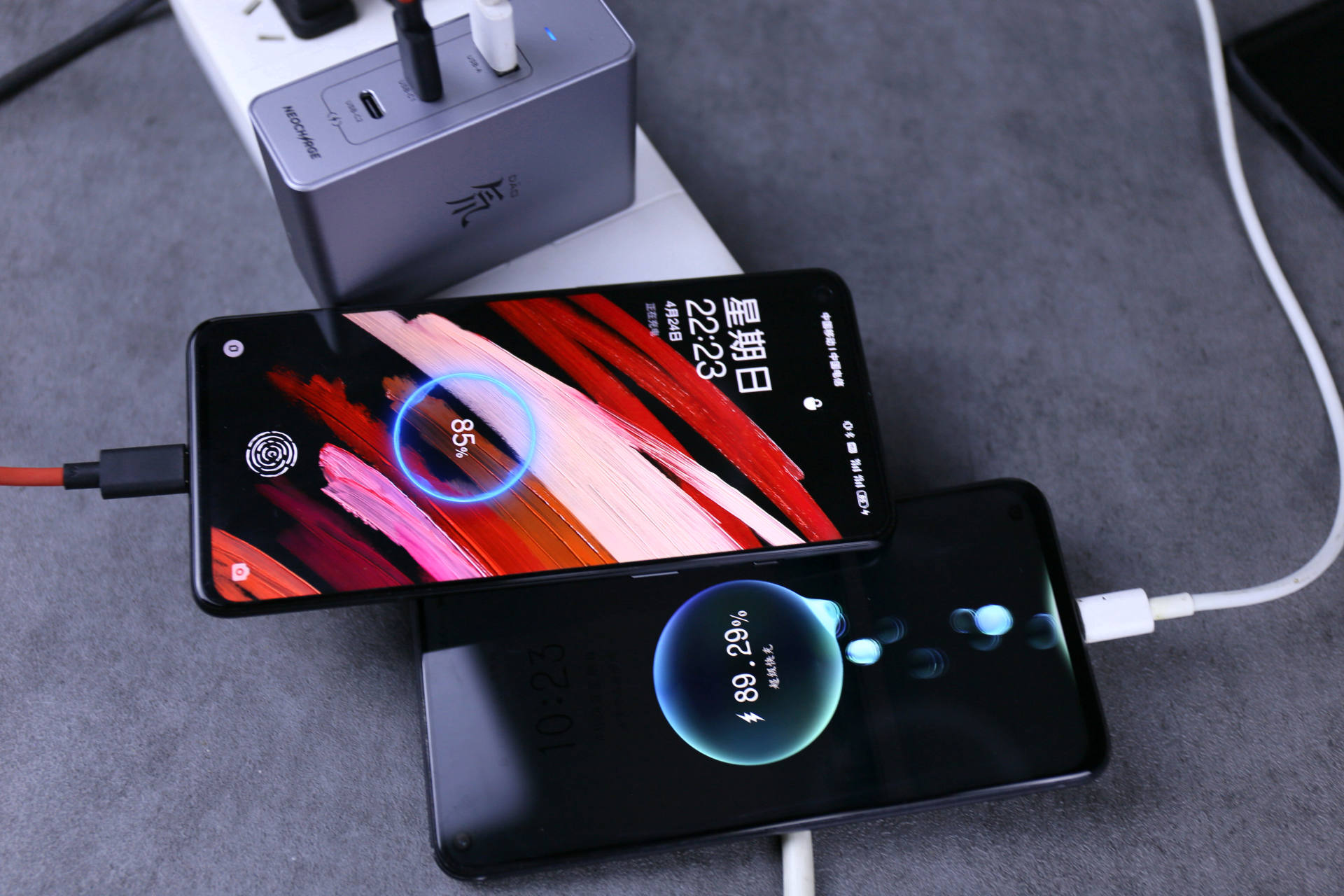 当我用努比亚120W氘锋氮化镓荣耀V20和一加9RT同时充电时,虽然没有测量具体的输出功率,但是两部手机都显示在超级快充的状态下充电,充电速度也是很让人满意的。另外,当手机电量充到85%时,120W氘锋氮化镓会自动切换为涓流模式,保护电池健康。