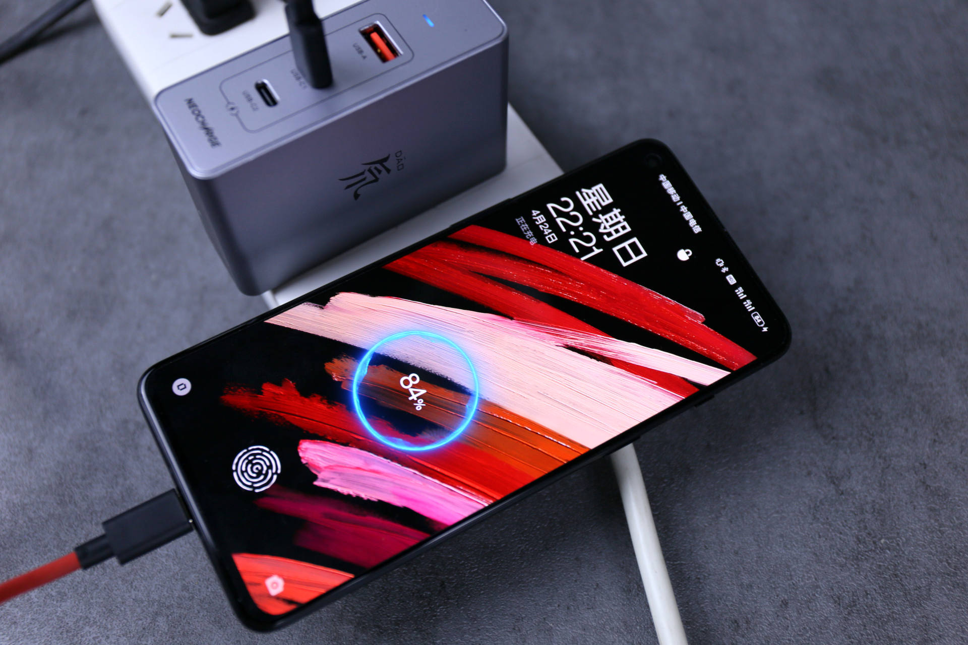 当我用努比亚120W氘锋氮化镓给一加9RT充电时,Type-C输出功率为55W左右,4500mAh容量电池大约30分钟左右就能够充满,这个充电速度是不是就很nice了!