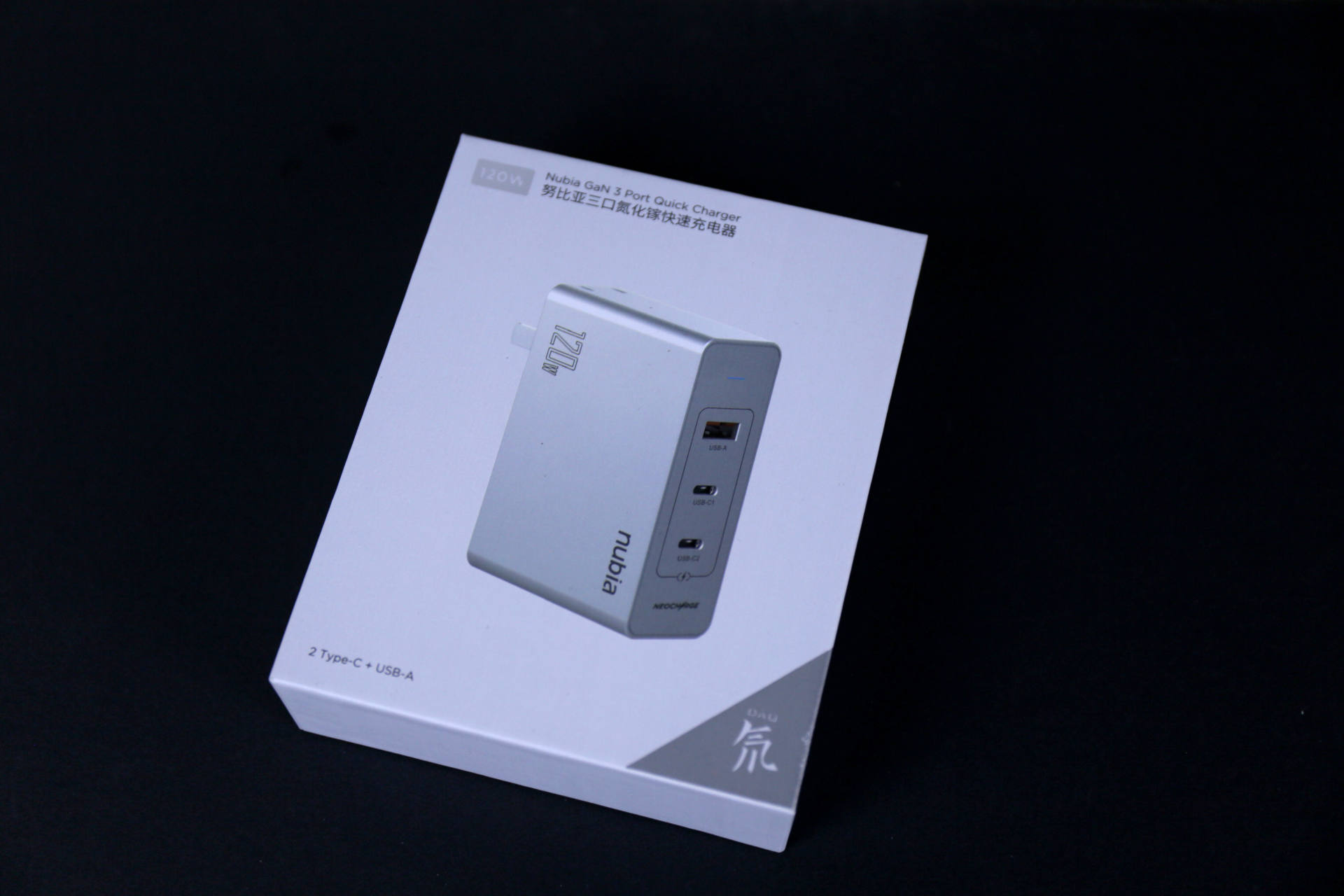 努比亚120W氘锋氮化镓的包装采用简洁、明快的设计风格。正面印着产品名称、产品图以及右下角的氘字,形成了上中下三层,层次感十足;背面则是印着品牌商的信息。