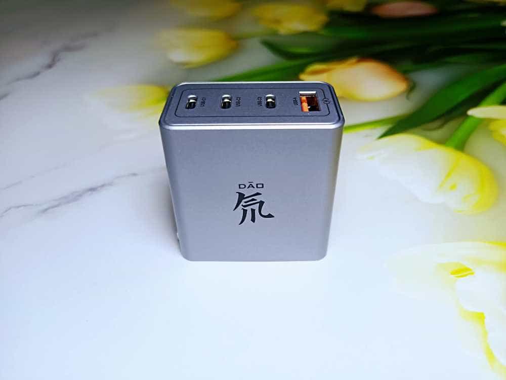 努比亚氘锋能量块65w四口氮化镓充电器沿用了前几代的氘峰外观设计,银色的类金属质感涂层使得整个充电器看起来十分硬朗帅气,加上侧面印有一个大大的“氘”字标志,一下子提升了整个充电器的逼格,十分适合商务人士。