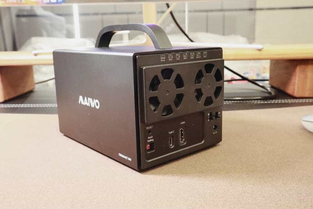 麦沃K35274D硬盘阵列盒背面接口分别为电源接口、HDMI接口、Type-C接口。同时还把四个开关都设计在设备背面,分别为风扇开关、电源开关、RAID复位开关、RAID控制调整开关,还可以看到内置的双位滚珠式静音风扇,同时配合另外一侧的大面积蜂窝孔以及二档风力切换,从根本上确保设备的正常运行, 也延长电子元器件的使用寿命。