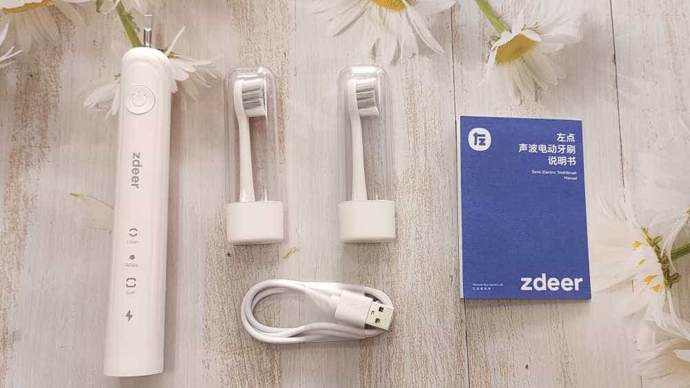 左点声波电动牙刷的配件有:一个牙刷手柄,一根TYPE-C充电线,一份说明书,2个刷头及透明小管。它有白色和粉色两种配色,情侣使用更搭。我入手的是皓月白色。