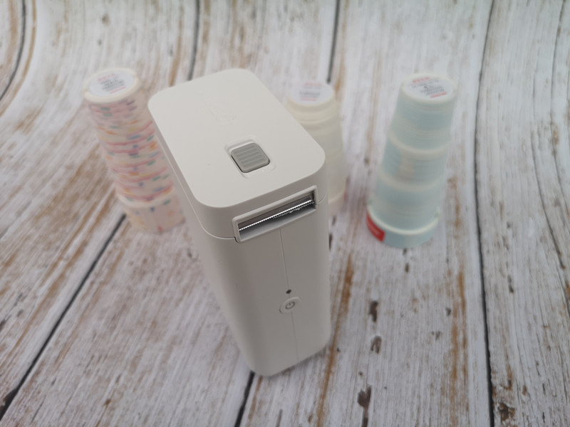 自然持握之后,主机对着使用者的一面有出纸口、电源键和状态指示灯,出纸口上还有一个隐藏式的裁纸刀,方便整齐地裁下标签。