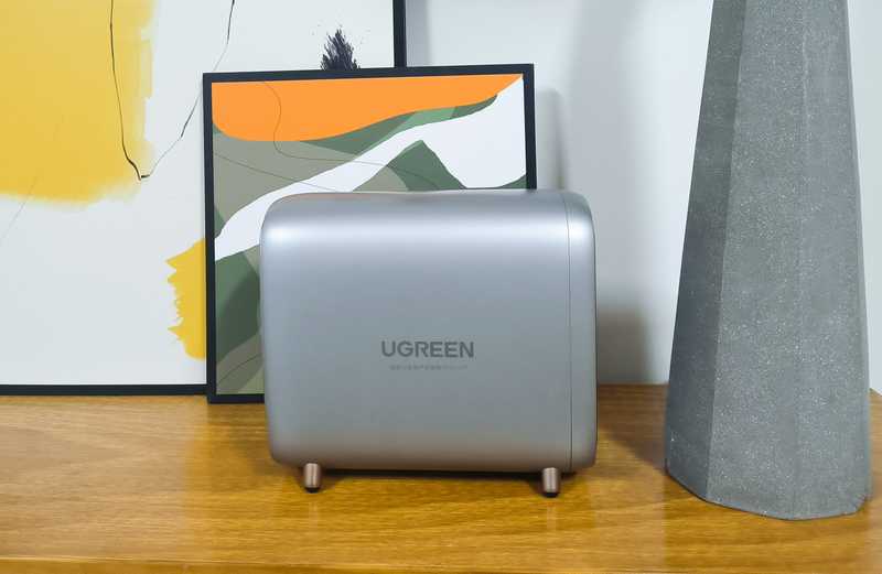 刚入手放在家里的时候家里人还不知道是什么东西,在我解释了一番之后才知道可以存手机上的资料。和其它NAS不一样的是,绿联私有云DH2600外观并没有采用传统的小机箱造型,在我看来它的外观更像是一个颜值很高的家居用品,通体银色加玫瑰金的金属喷漆,还有4个用于支撑的小腿。