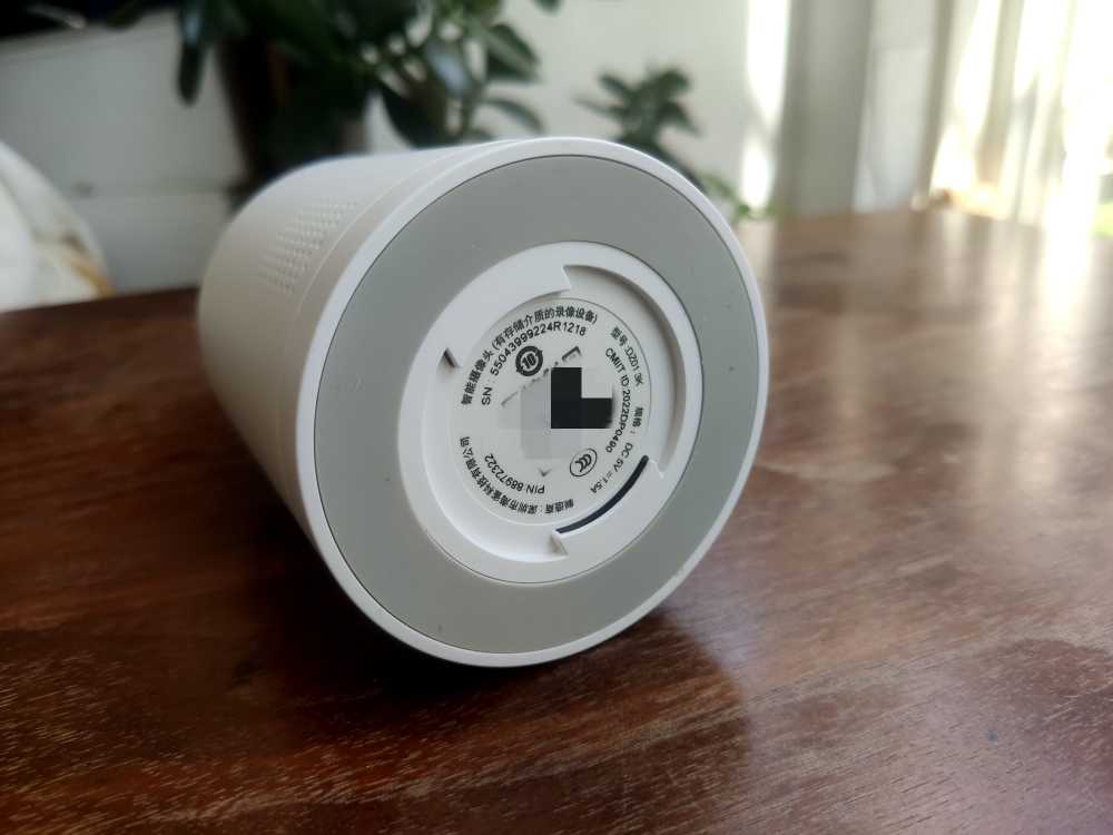摄像头底部印有部分有关参数信息。此外,底部还配有防滑脚垫和吊装倒挂接口。平放还是倒挂可以根据需要自主选择,完全不受限制,不用担心移动和掉落,省心又省力。小编直接把摄像头放在了书橱内,不细看您可能找不到的。哈哈!