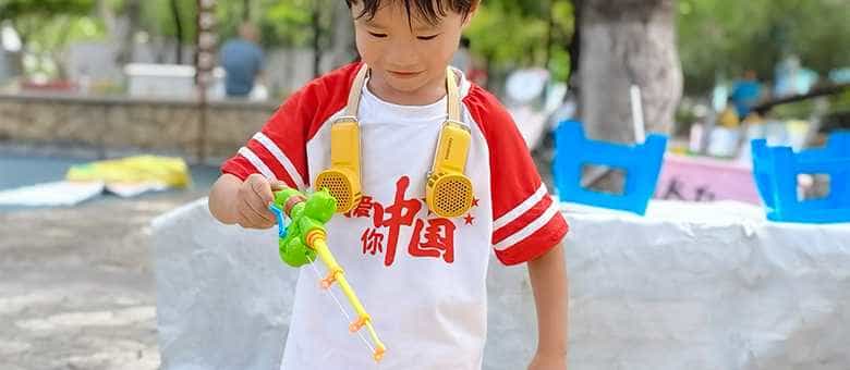 同样的情况下,其他小朋友可以满头大汗,有点家长还蹲一旁给扇风,儿子带着挂脖风扇一点也不受影响,清凉劲爽的风无形中帮他挡住了大部分的热浪,挂脖式也丝毫不影响他铲沙子的速度。