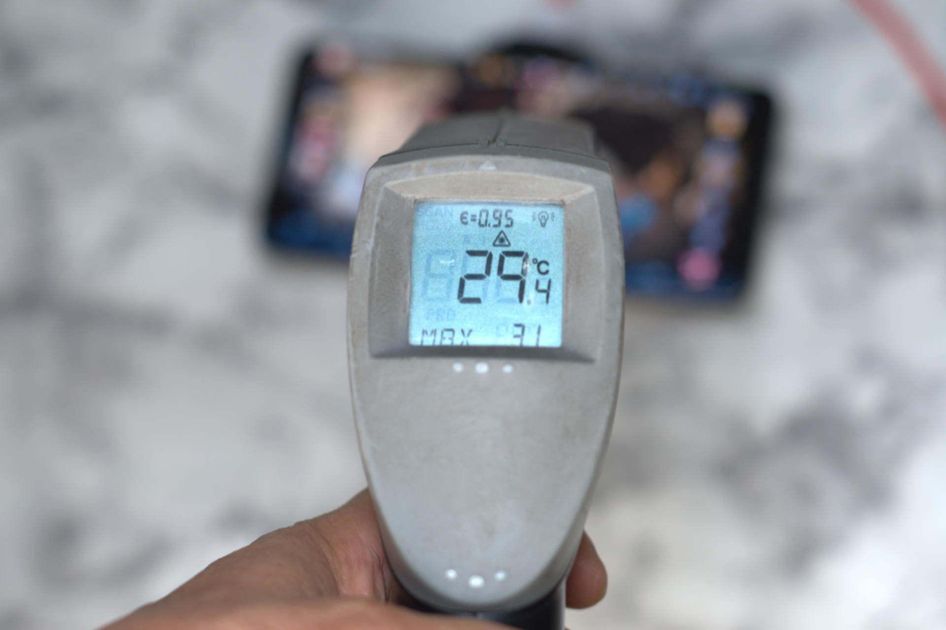 我在室温25℃的条件下,测试手机为一加10 Pro,HYPERBOOST为电竞模式,《王者荣耀》配置特效全开,在没有安装背夹的情况下进行一个小时的游戏,测得温度为38.4℃,其实这个温度在夏天玩王者也是丝毫没有问题的。