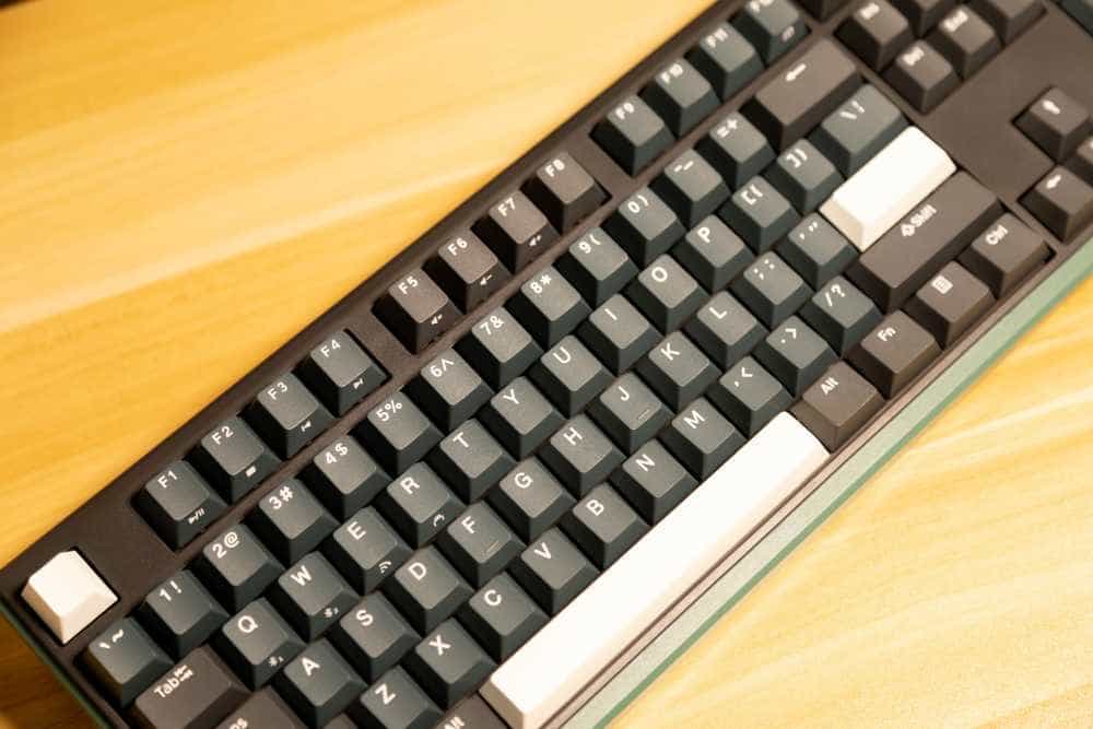 目前拿到手的是一款K610W孤岛配色,当然这个配色的名称是官方命名的,事实上其实就是墨绿色为主要的设计元素。就目前我们看到的这款键盘来说,和市面上绝大多数的104键的产品没没有什么太大的区别。但是在配色方面会更让大家觉得舒服,绿白相间,给人一种仿佛置身于岛屿之中的感觉,不愧于孤岛这个命名。