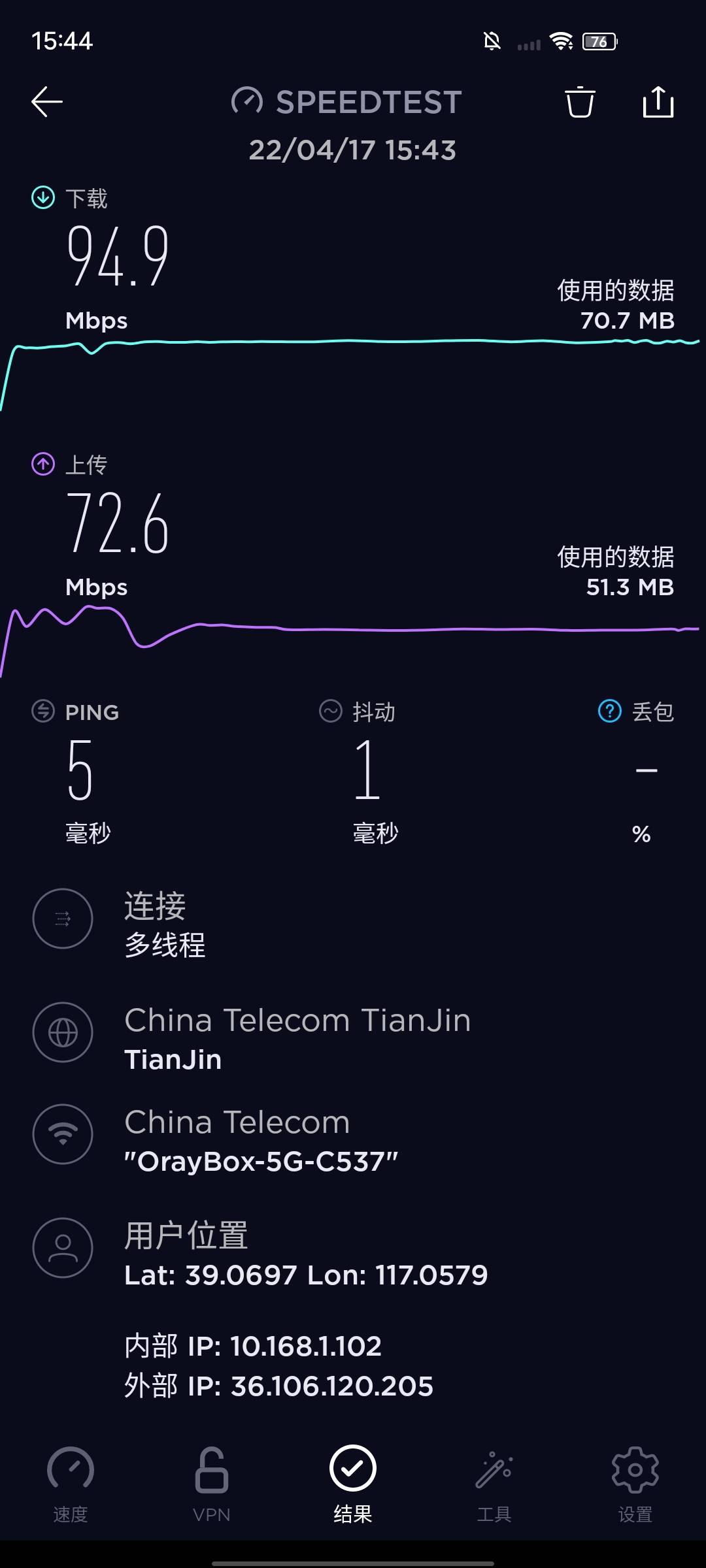 再用Speedtest第三方测速软件对5GWiFi进行测试,可以看到5GWiFi的下载速度可达到94.9Mbps,上传速度可达到72.6Mbps,网络的Ping值5毫秒,抖动1毫秒,网络强度还是很不错的,表现比较优异。