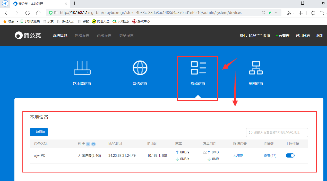 在管理界面的终端信息栏,可以看到目前路由器网络接入的设备情况。