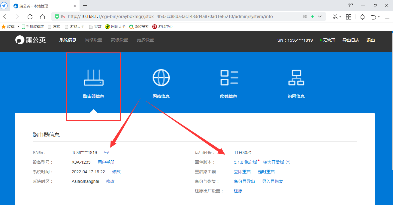 在蒲公英的管理界面路由器信息,可以查看路由器的的运行情况和设备信息。