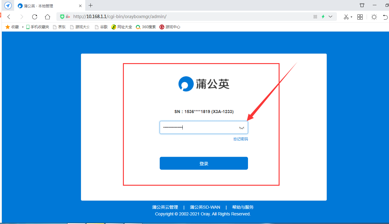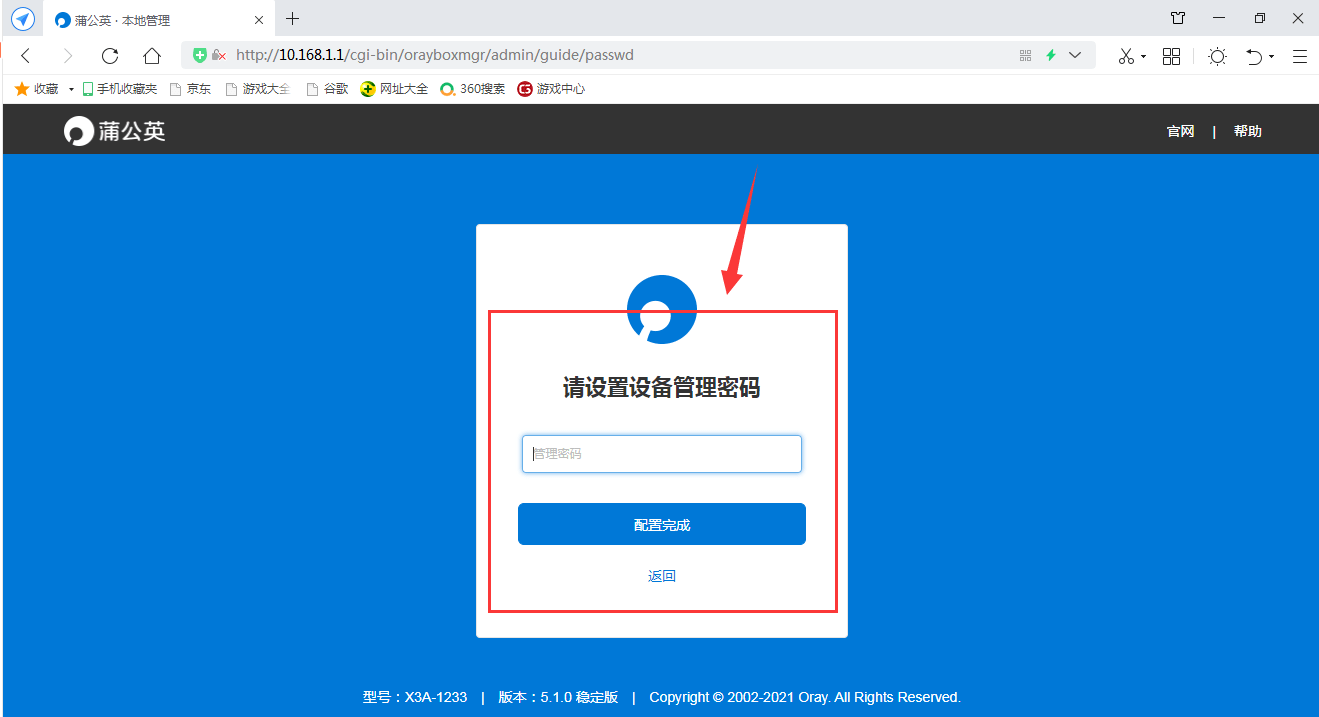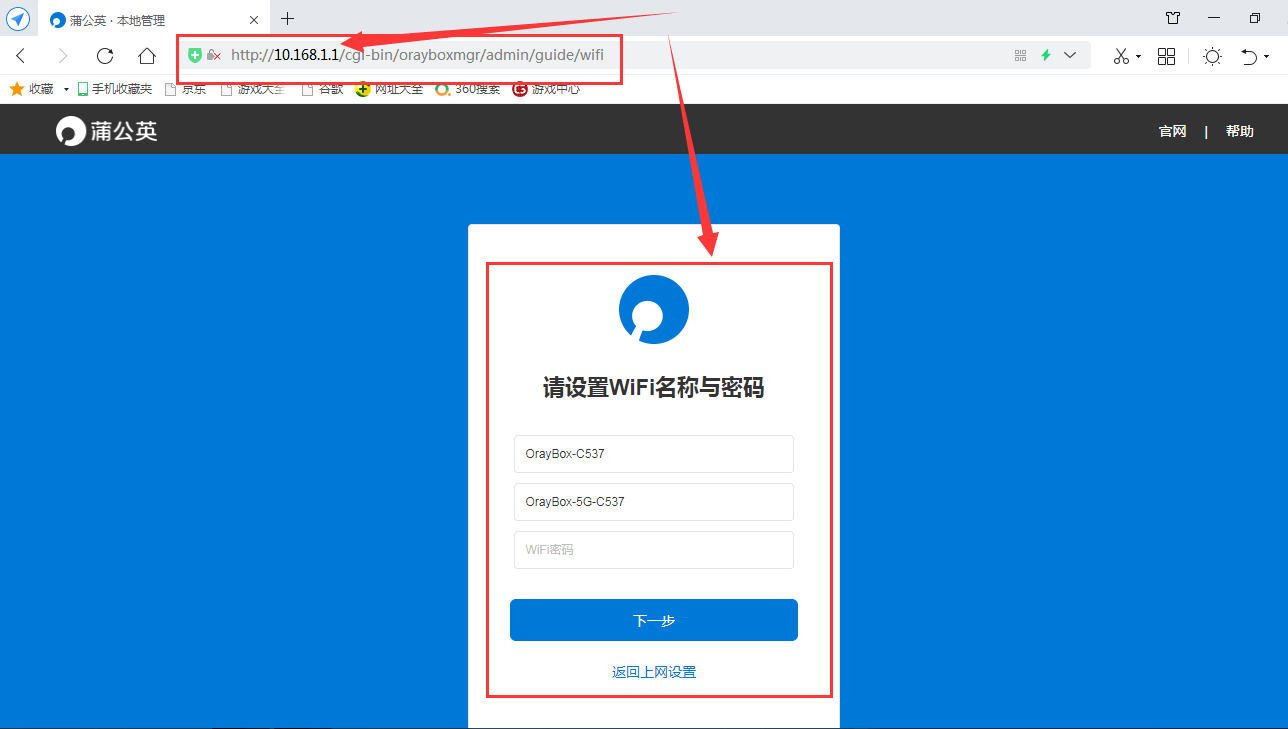 在电脑端输入oraybox.com或者10.168.1.1,即可进行路由器的设置界面,在页面可以更改WiFi的名称和设置WiFi密码。进而对设备的管理密码进行设置,完成所有的设置后,即可登录蒲公英的管理界面了。
