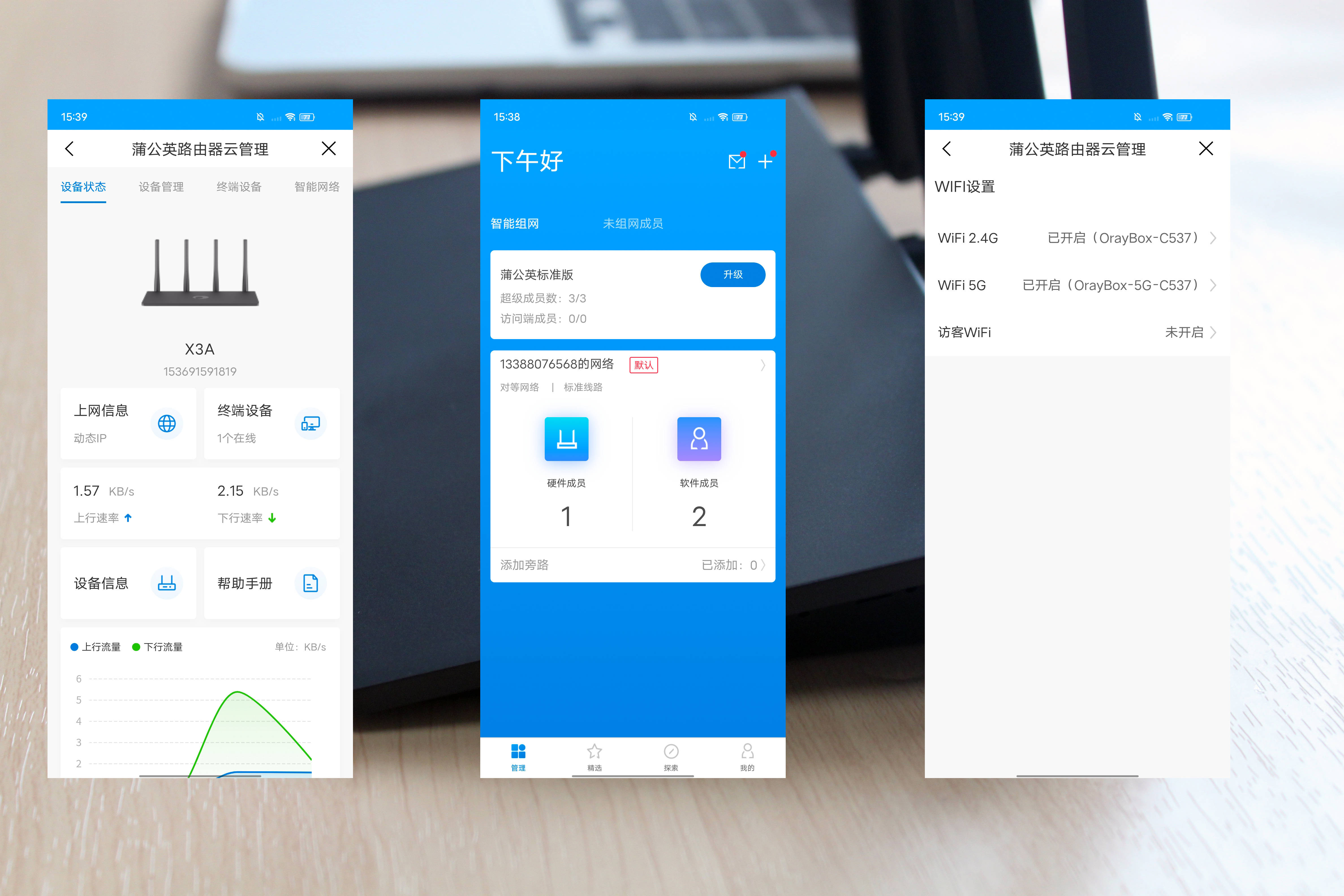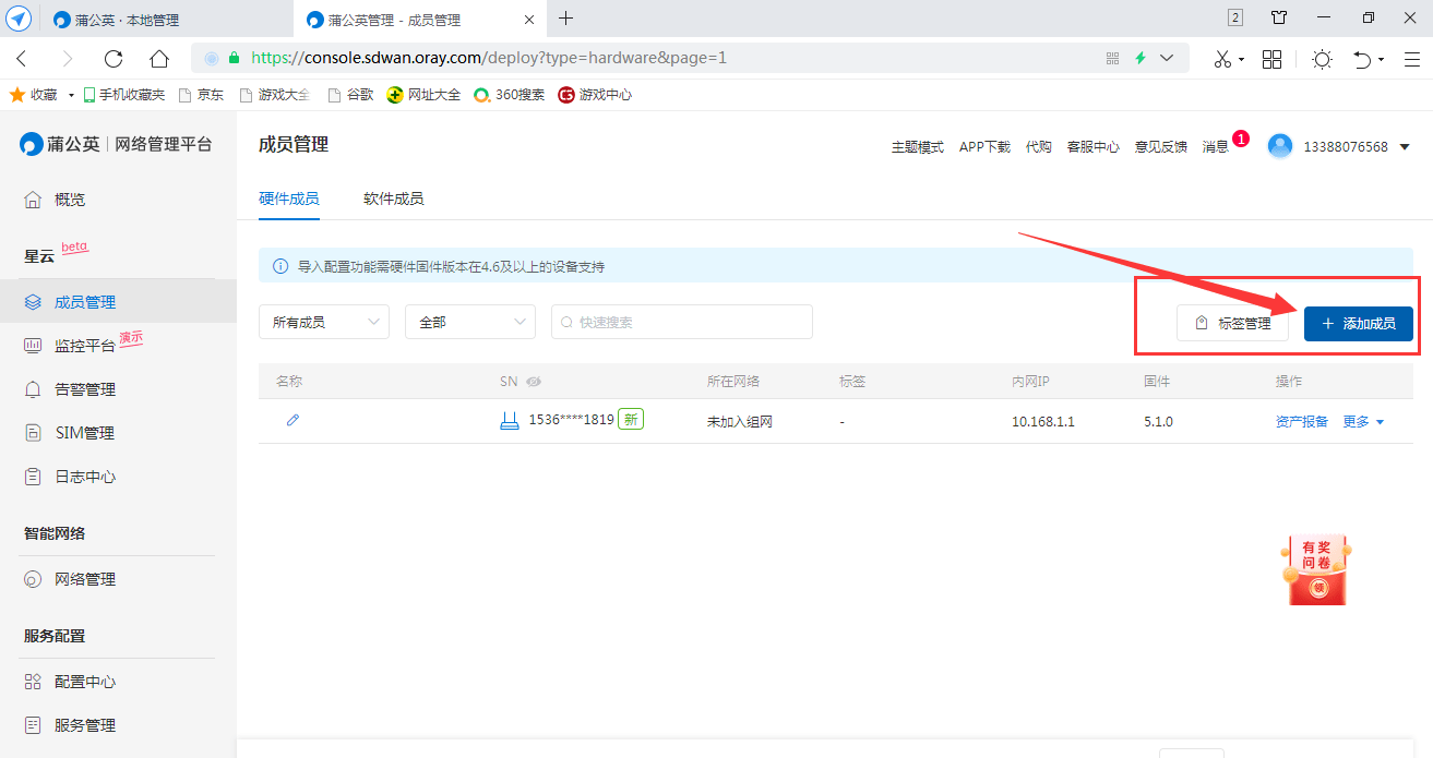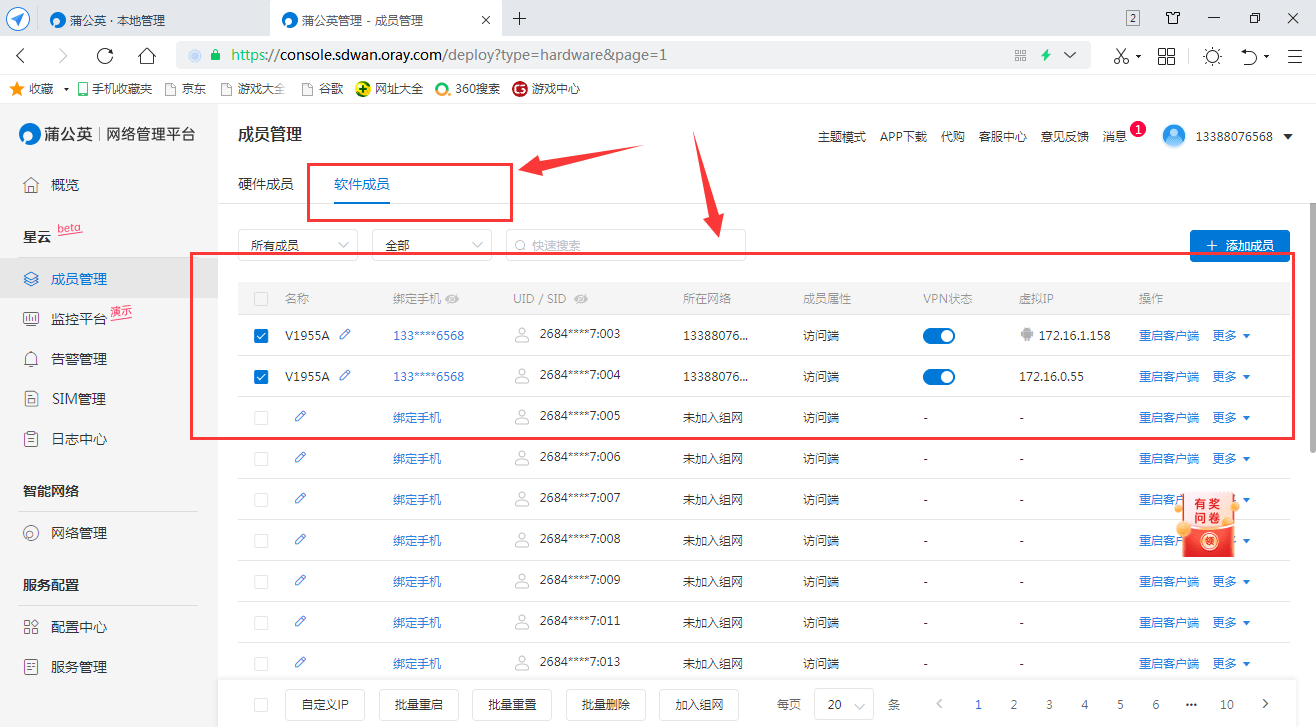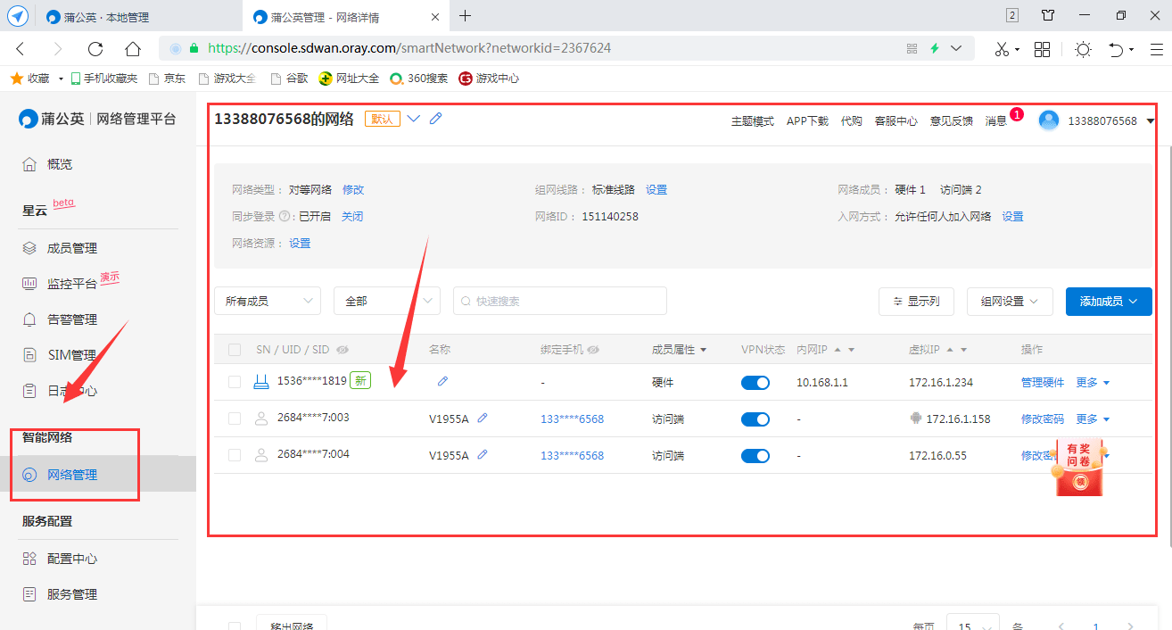在蒲公英网络管理平台中,选择需要添加的硬件和软件成员,以来完成组网。完成组网后,可以看到智能组网的信息和成员,这样网内的软件成员就可以通过远程来对路由器进行操作了。