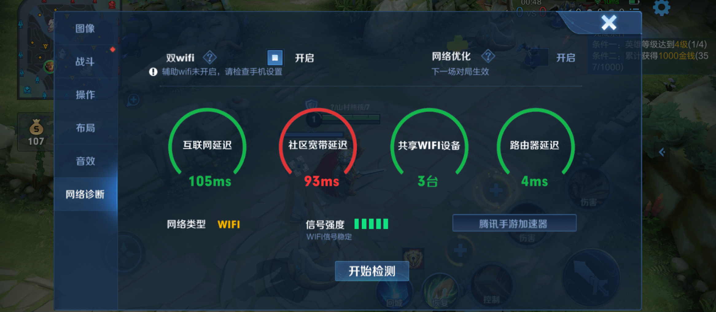 在5GWiFi的网络环境中,玩了一把《王者荣耀》,游戏页面可以看到互联网和社区宽带的延迟比较严重,但是路由器的路由器的延迟却很低,WiFi信号强度很稳定,在游戏过程中比较流畅,有很不错的游戏体验。
