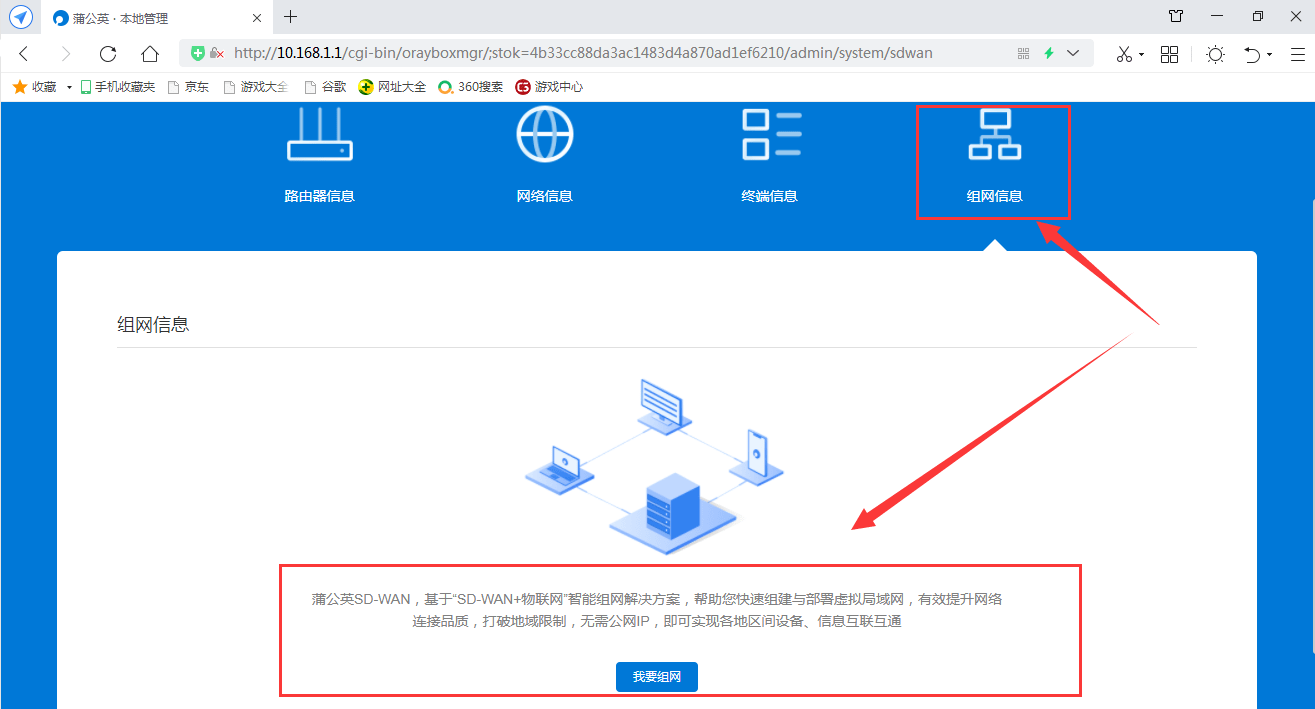 在管理界面的组网信息栏,选择我要组网,即可进行路由器的组网管理系统。